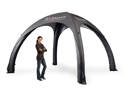 Det oppustelige eventtelt, Airtent, leveres i flere forskellige størrelser. Der er mulighed for at koble det sammen med flere telte, så du kan udbygge efter behov. Selve Airtents konstruktion leveres i farverne sort, hvid, blå, rød, grå eller grøn mens tagdugen leveres som fuldprint. Pløkker, barduner og rygsæk følger med som standard.