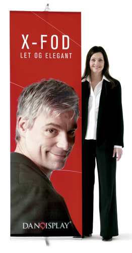 Robust bannerdisplay. Print til X-fod leveres på et 280g stofbanner og fås i flere forskellige bredder, og i ønsket højde op til 300 cm. Kontakt os for flere størrelser og kombinationer. Leveres i transporttaske. Mulighed for spots. Gennemtestet og nøje udvalgt kvalitet til lavpris.