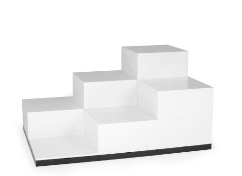 EasyCubes til opbygning af gulve, podier, tårne, borde osv. EasyCubes består af en bund, selve kuben og en topplade som dekorativ afslutning. Bund, kube og topplade leveres som standard i hvid og sort.